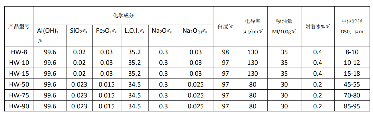 超细氢氧化铝Ø 产品性能 u 优良的阻燃性 u 良好的力学性能 u 良好的相容性 u 良好的分散性 Ø 产品用途 u 高档铜版纸涂料 u 聚氨酯发泡材料 u 低烟无卤电缆 u 电线母料阻燃剂 u 乳胶制品 u 绝缘品 u 合成橡胶 u 热塑性塑料 u 地毯 u 装饰材料 Ø 产品包装 u 薄膜内衬、涂膜塑编袋或复合纸袋包装 u 净重:20公斤/袋、25公斤/袋