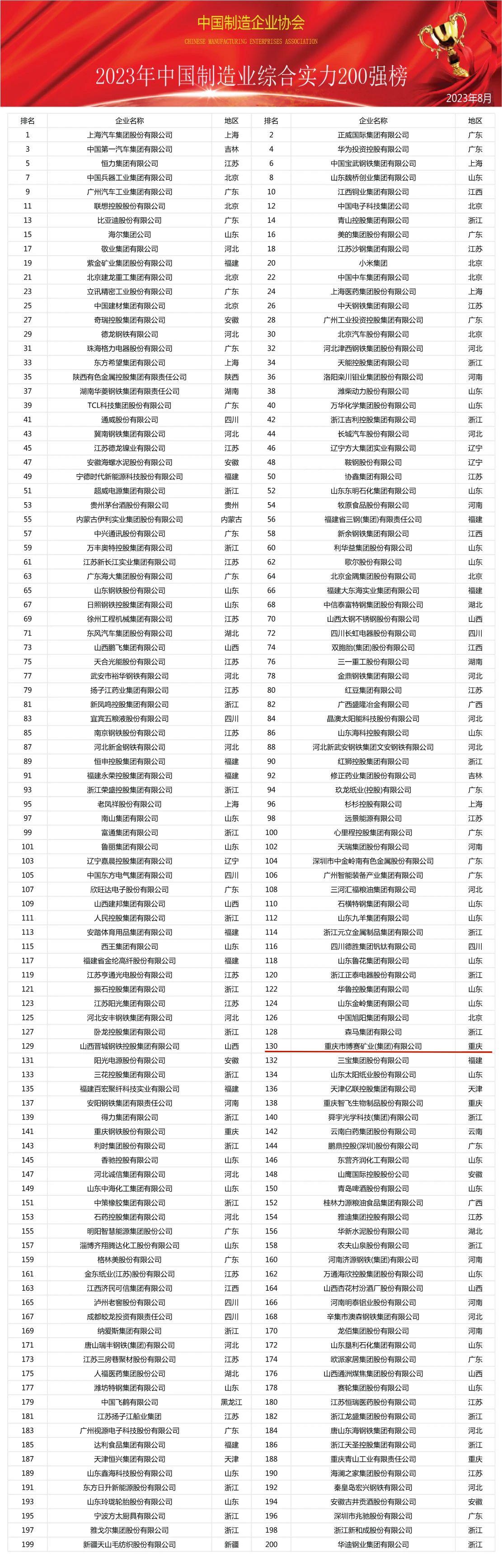 该排行榜是中国制造企业协会全面科学调研我国制造业企业实力后发布的榜单,采集研究了超过8000家利润总额在5000万元至500亿之间的中国大陆制造型企业,根据营业收入、资产总额、利润总额等指标进行评选,从中遴选出了包含博赛集团在内的中国制造业综合实力200强企业。
