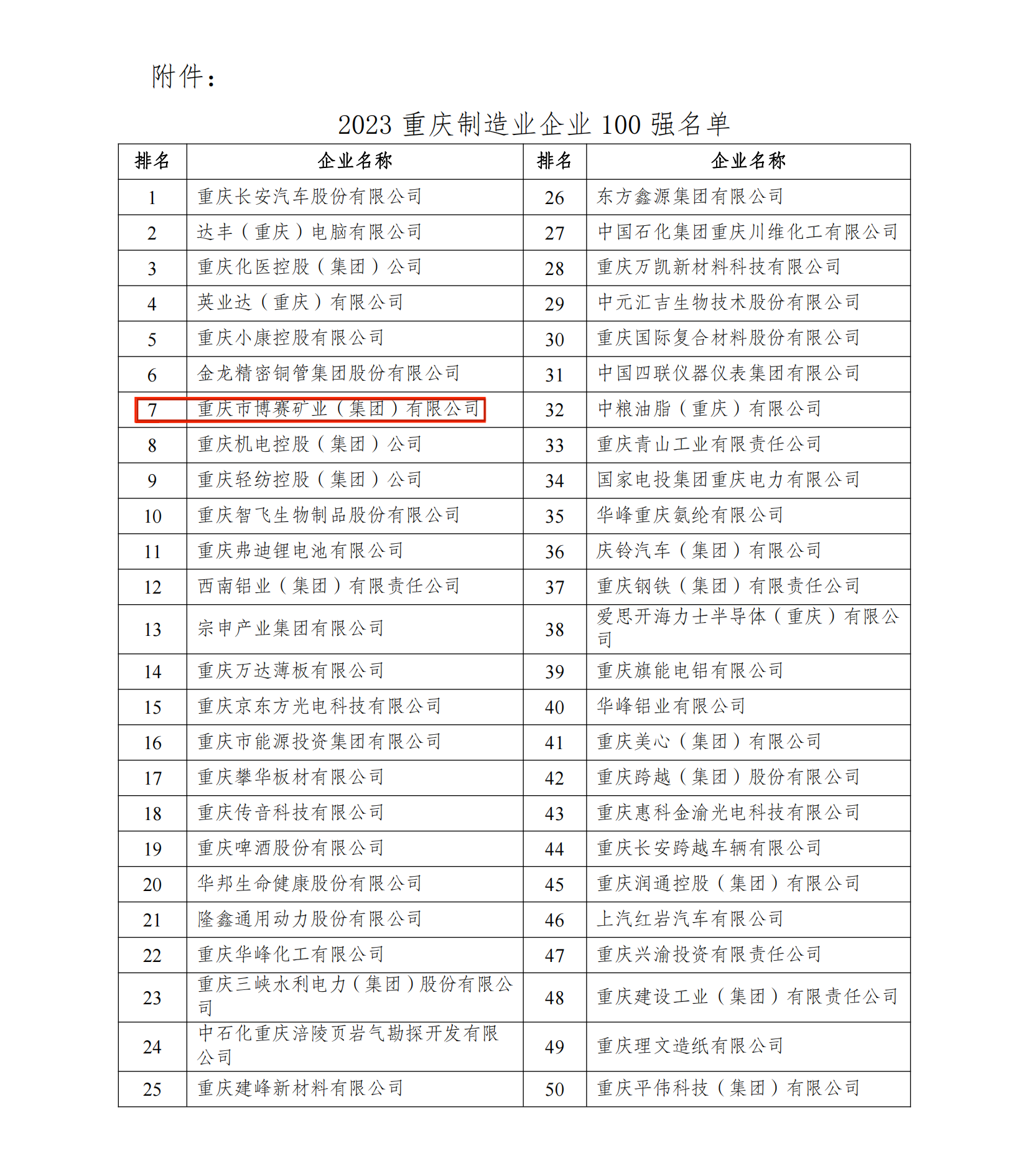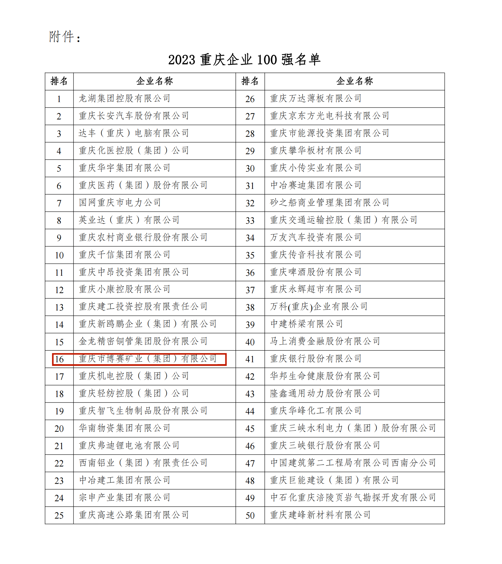 近日,重庆市企业联合会召开了“2023重庆百强企业发布会”,在会上揭晓了2023重庆企业100强、2023重庆制造业企业100强等名单。博赛集团今年继续位列其中,荣登2023重庆企业100强第16位,比去年上升两位;2023重庆制造业企业100强第7位,和去年持平。
